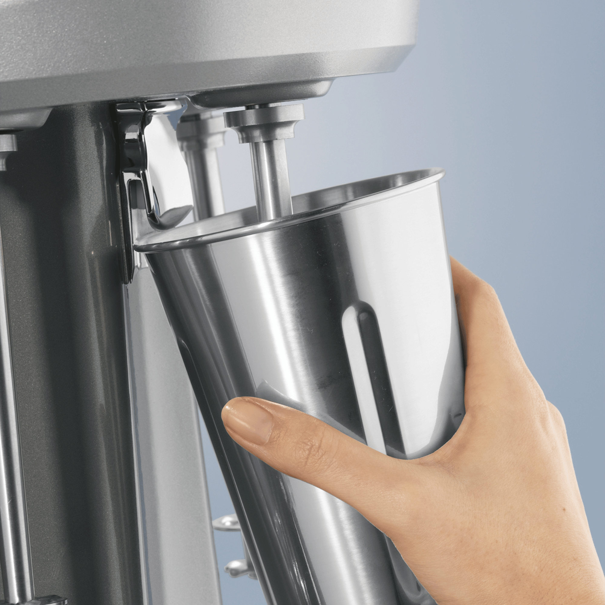 Gładka obudowa wykonana ze stali nierdzewnej i wytrzymałego odlewu aluminiowego łatwo się czyści. Prowadnicę kubka można również wyjąć w celu umycia ich w zmywarce.
