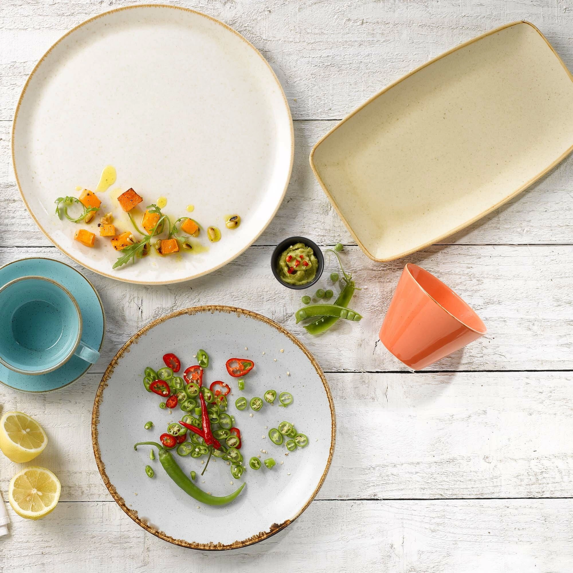 **Każdy element zastawy jest unikalny** Do barwienia produktów kolekcji Seasons Sand wykorzystywane są naturalne barwniki, tlenki żelaza oraz rzemieślnicze techniki. Proces ten sprawia, że każdy element może reagować inaczej podczas wypalania i szkliwienia, co prowadzi do różnic w fakturze, tonacji i kolorze. Nie są to wady, lecz cechy wynikające z ręcznej produkcji i użycia naturalnych materiałów. Do mieszanki szkliwa dodawany jest cyrkon, aby uzyskać pożądany odcień koloru oraz zwiększyć twardość powierzchni szkliwa. Ze względu na tę zwiększoną twardość, podczas używania metalowych sztućców, takich jak widelce czy noże, mogą pojawić się ślady. Nie świadczy to o obniżonej jakości produktu, lecz jest związane z technicznymi właściwościami porcelany. Ślady te można usuwać średnio co pół roku, stosując odpowiedni środek do czyszczenia powierzchni porcelany.
